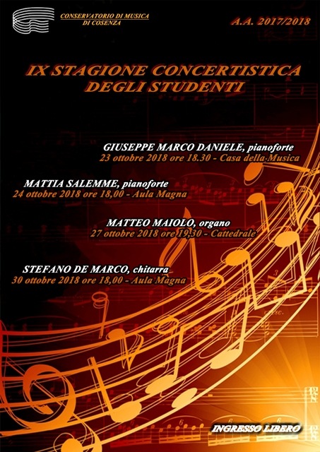 Si precisa che il concerto previsto in data 24/10/2018 è anticipato, per ragioni istituzionali, alle ore 17 e si svolgerà sempre nell'aula Magna del Conservatorio.